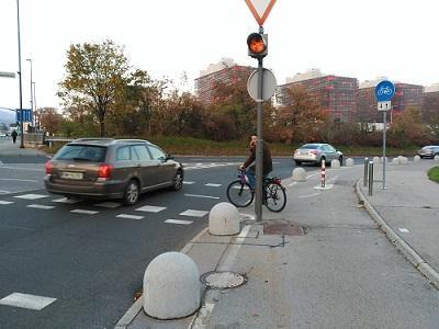 semafor za zavijanje desno, kolesarska steza bi bila speljana
