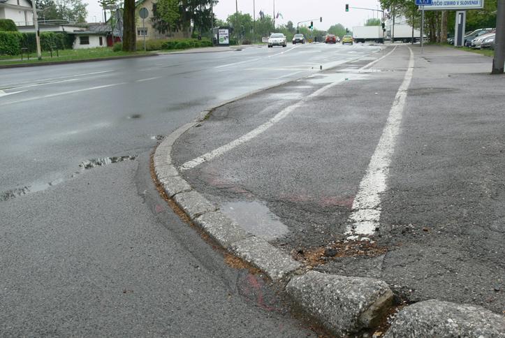 nasproti bencinske črpalke, je robnik preko kolesarske steze v tako